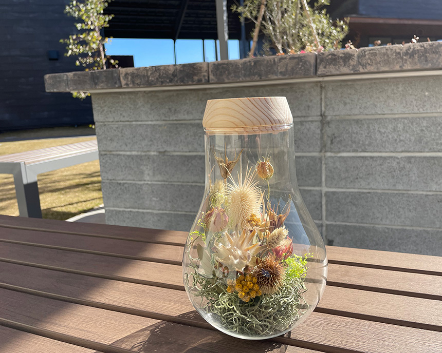 内容: ボトルの外で、オアシスにドライフラワーを装飾していきます。